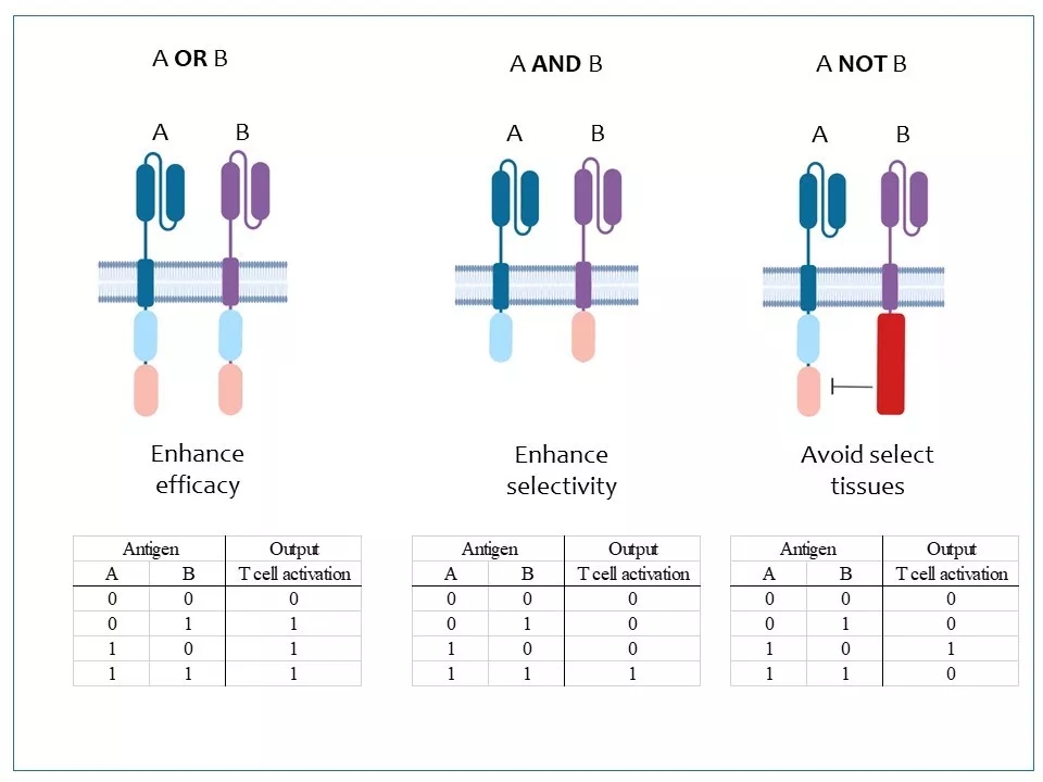 20 Senti Bio在CAR-T中引进了更多的逻辑门。除了多靶点识别的“与门”(A AND B)外,还有“或门”(A OR B)和SAND (“A NOT B”)。每种逻辑门的功效不同,可以根据实际需要灵活选择。