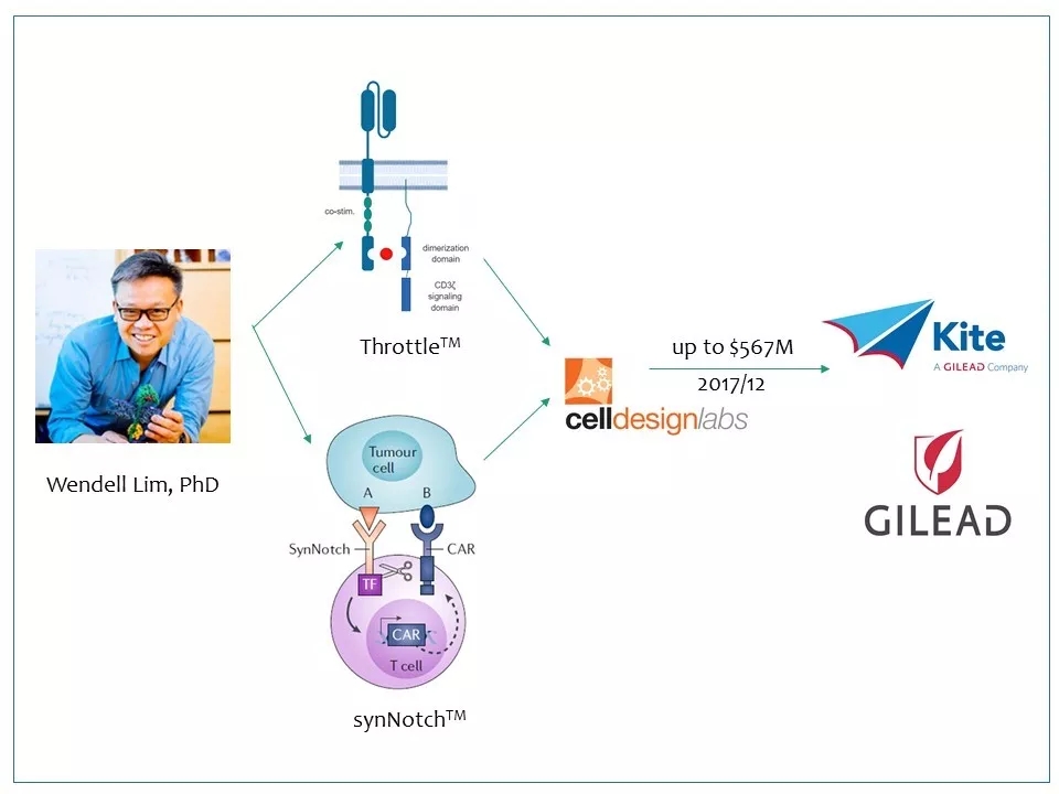 17 除了SynNotch CAR-T技术,Lim的团队还发明了ThrottleTM技术——用小分子药开关CAR-T。以这两个技术为基础,Lim于2015年创立了Cell Design Labs公司。Cell Design Labs与另一家CAR-T公司Kite有合作关系。2017年,在Gilead并购了Kite之后,Kite/Gilead几个月后又收购了Cell Design Labs。首付1.75亿美元,再加上各种里程碑,收购价最高可达5.67亿美元。