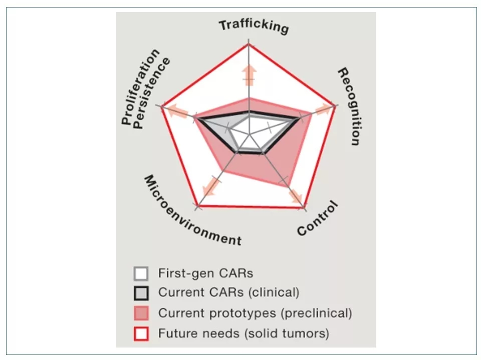 10 改进CAR-T的产品性能也正是从这五个维度下手。对实体瘤来说,“渗入”和“破境”是前提。而对所有肿瘤而言,提高疗效的重点是改进“识别”和“持久”,提高安全性的重点则是完善“识别”和“控制”。