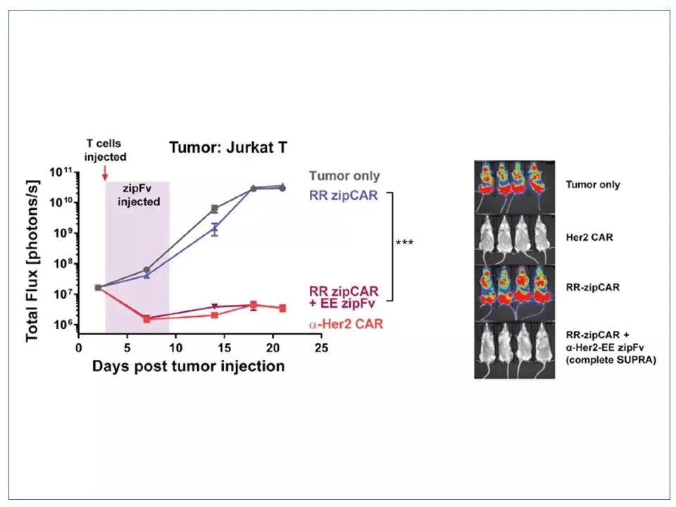 22 SUPRA CAR技术在小鼠肿瘤模型中已经得到验证。单独输入RR zipCAR T细胞并不能减少肿瘤负荷。只有同时引进EE zipFv蛋白后,RR zipCAR T + EE zipFv(RRzip与EEzip互补)才能有效抑制肿瘤,其活性接近于一个传统的CAR-T(a-Her2 CAR)。