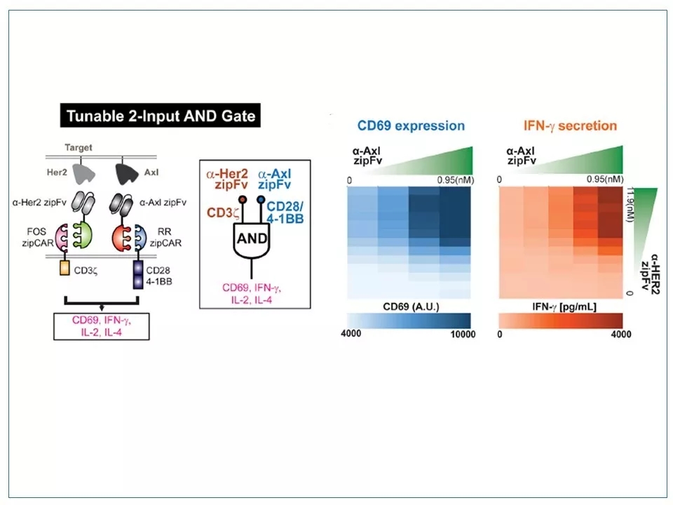 24 SUPRA CAR系统实现的可调性“与门”展示。RR zipCAR和FOS zipCAR分别装备了CD28 / 4-1BB共刺激域和CD3z信号域,信号传导相对独立。a-Her2 zipFv与FOS zipCAR结合,进一步被抗原Her2激活后,指令下传给CD3z结构域,继而增加CD69的表达;而a-Axl zipFv与RR zipCAR结合,进一步被抗原Axl激活后,指令下传给CD28 / 4-1BB共刺激结构域,继而增加了IFN-g等细胞因子的释放。改变每个zipFv的浓度可以调节来自每个受体的信号输出强度,而且这两个通路有很强的协同作用。