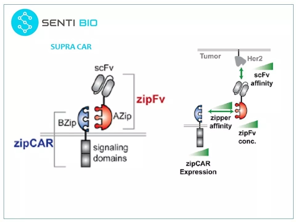21 SUPRA CAR技术可以帮助实现这些逻辑门。SUPRA CAR系统中,CAR蛋白被分拆,成为两个蛋白:zipCAR和zipFv。zipCAR是跨膜蛋白,其细胞外结构是一个亮氨酸拉链,而zipFv是一个融合scFv,装有同源亮氨酸拉链,可以与zipCAR上的亮氨酸拉链互补结合。这个系统将CAR-T模块化,带来了更大的灵活性。其治疗模式是细胞治疗加蛋白治疗。对不同的肿瘤,只需一种zip-CAR-T细胞,但需要更换不同的传感器——zipFv。SUPRA CAR系统可以通过改变以下几个变量来调整其特性:(1)亮氨酸拉链对之间的亲和力,(2)肿瘤抗原和scFv之间的亲和力,(3)zipFv的浓度,和(4)zipCAR的表达水平。
