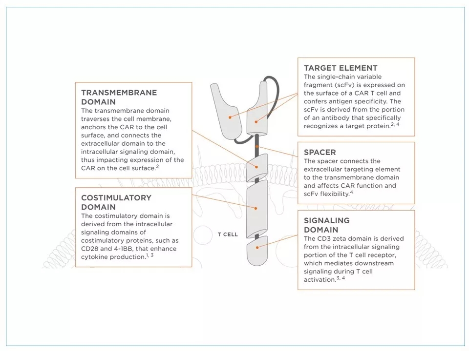 3 CAR-T细胞疗法是一个典型的“模仿自然,高于自然”的创新。CAR蛋白的设计建立在T细胞受体(TCR)的基础上,但在机理上又摆脱了MHC/HLA的限制,并引进了CD28、4-1BB等结构元素。CAR蛋白一般具有以下几个结构域:(1)细胞膜外的抗原识别片段:多为单链可变片段(scFv),相当于一个小抗体;(2)scFv和跨膜域之间的联结区:其长短会影响CAR-T的活性;(3)跨膜域:联结CAR膜外结构与膜内信号传导结构;(4)共刺激域:从第二代CAR-T开始引进,有加强细胞因子表达、促进T细胞增殖的功能;(5) 信号传导域:可激活T细胞,引起对癌细胞的杀伤作用。