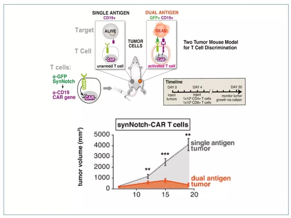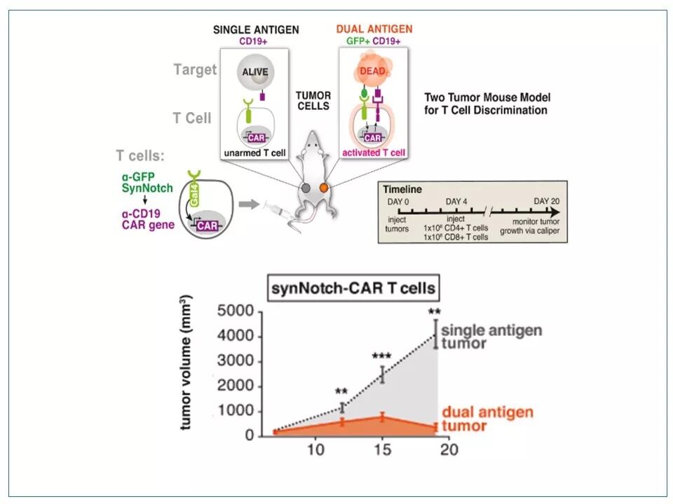 14 SynNotch技术在小鼠实验中已被验证。小鼠左侧接种单抗原肿瘤,右侧接种双抗原肿瘤。静脉注射的人源SynNotch CAR T 细胞(CD4+细胞和CD8+细胞1:1的混合)只对双抗原的肿瘤有疗效。