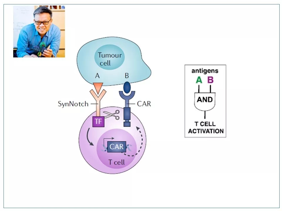 13 沿着这一思路,加州大学(旧金山)的Wendell Lim教授发明了SynNotch技术。SynNotch是一种合成的Notch受体,通过基因工程在T细胞表面永久性地表达。我们可以把它看作一种新型的CAR,其膜外结构也是抗体片段,识别并结合抗原A。A的结合引起SynNotch的膜内肽链被裂解,释放出连接的转录因子。转录因子进入细胞核,特异性地启动第二个CAR的转录。第二个CAR表达后,插入细胞膜,如果遇到第二个抗原B,会进一步激活下游信号,进入杀伤模式。SynNotch技术相当于给T细胞装了一个“与门”, 只有在接触到的细胞表达两种抗原A和B的情况下,才会被激活。