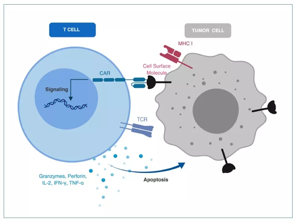 5 CAR-T对肿瘤细胞的杀伤力来源于CAR激活后启动的信号传导通路。在CAR-T表面的CAR与肿瘤细胞表面的特定抗原结合后,通过一系列信号传导,或分泌多种细胞因子,或释放颗粒酶、穿孔素等蛋白,从而引起肿瘤细胞的自杀。
