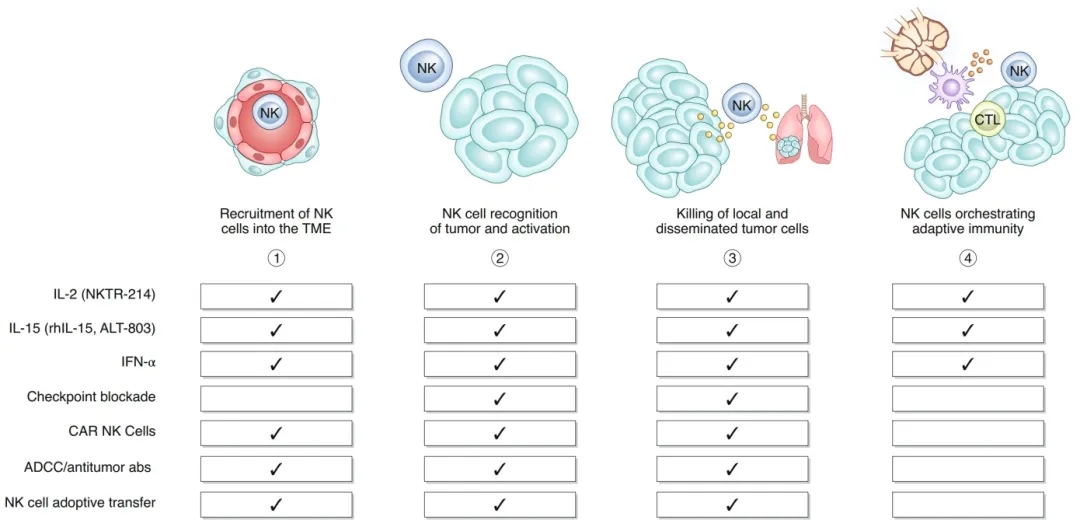 图4:影响NK细胞-癌症循环各个步骤的治疗。