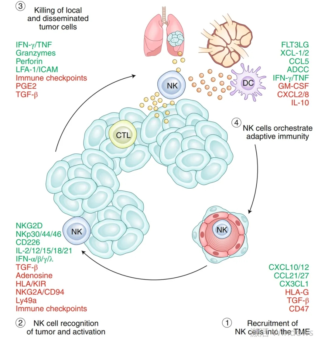 NK细胞整合各种刺激或抑制信号,影响NK细胞癌周期的每一步。绿色是通过促进NK细胞活性对其产生正性调节影响的分子,红色是通过促进NK细胞活性对其产生负性调节影响的分子。这些负性信号是防止过度的免疫反应导致恶化组织损伤所必需的。然而,在TME中,这些途径被癌细胞劫持,以逃脱NK细胞介导的免疫,并阻断适应性免疫的启动。