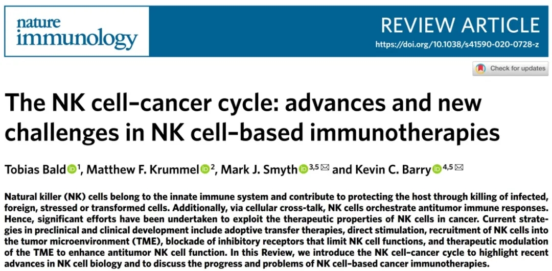 2020年7月20日,来自澳大利亚昆士兰医学研究院的Mark J. Smyth教授和美国西雅图佛瑞德·哈钦森癌症研究中心公共健康科学部的Kevin C. Barry课题组在Nature Immunology(IF: 20.479)杂志上发表题为“”的综述[1]。本文介绍了NK细胞-肿瘤循环,重点介绍了NK细胞生物学的最新进展,并对基于NK细胞的肿瘤免疫治疗的进展和存在的问题进行了讨论。
