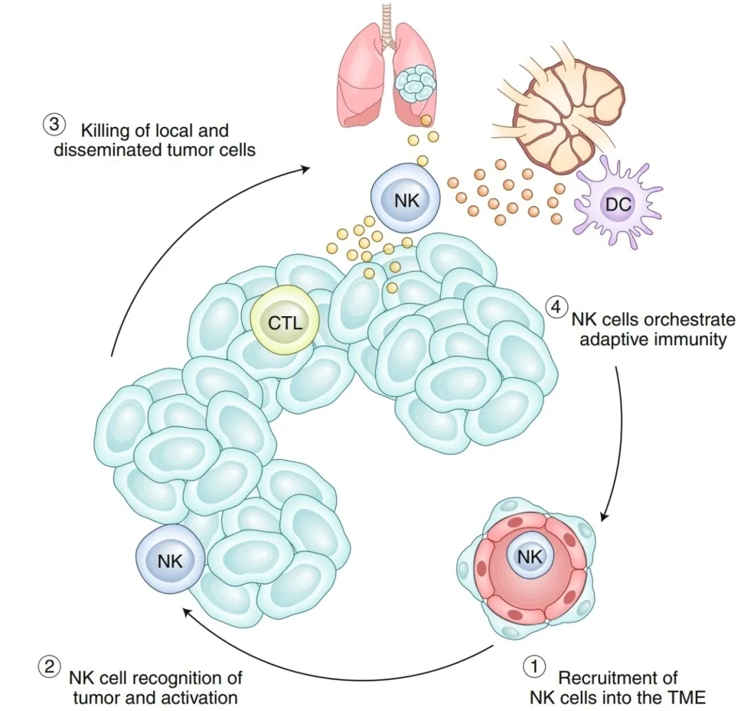 为有效地消灭癌细胞,身体需要启动一种自我扩散的抗肿瘤免疫反应。NK细胞-癌症循环包括启动和最大化这种先天反应的功效的四个重要步骤。(1) NK细胞被募集进入TME;(2) NK细胞能识别癌细胞并充分激活;(3) NK细胞局部和系统杀伤癌细胞;(4) NK细胞协调先天免疫和适应性免疫,例如,通过警醒树突状细胞。最后,由于TME局部或远处的癌细胞被清除,抗原、趋化因子和危险相关的分子模式被释放,这进一步激发先天适应反应,使循环再次开始。