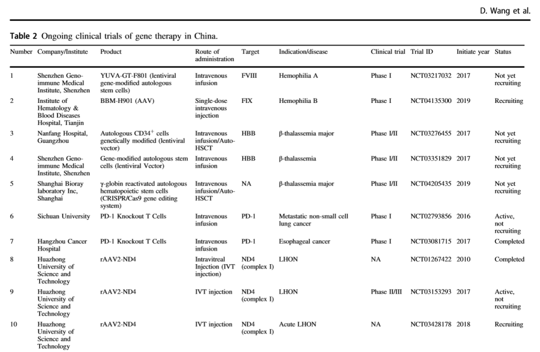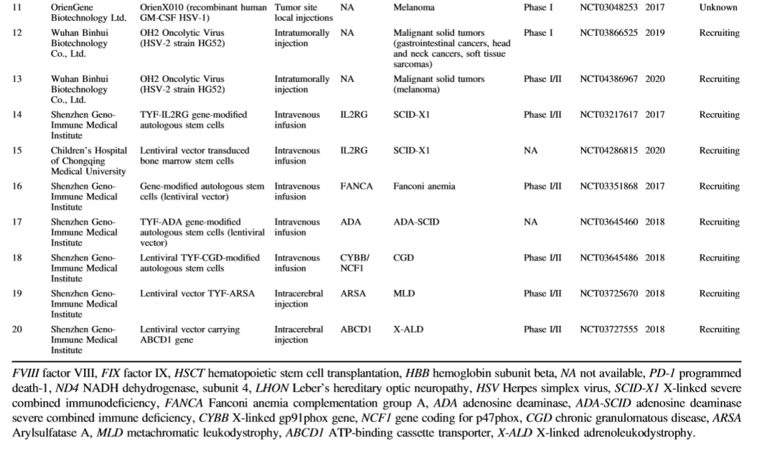 就目前而言,我国针对基因疗法领域正在进行的临床试验多达20余项(如下图所示);针对的适应症有A/B型血友病、β-地中海贫血、转移性非小细胞肺癌、食道癌、Leber遗传性视神经病变(LHON)、自身免疫性缺陷疾病以及各种实体瘤。