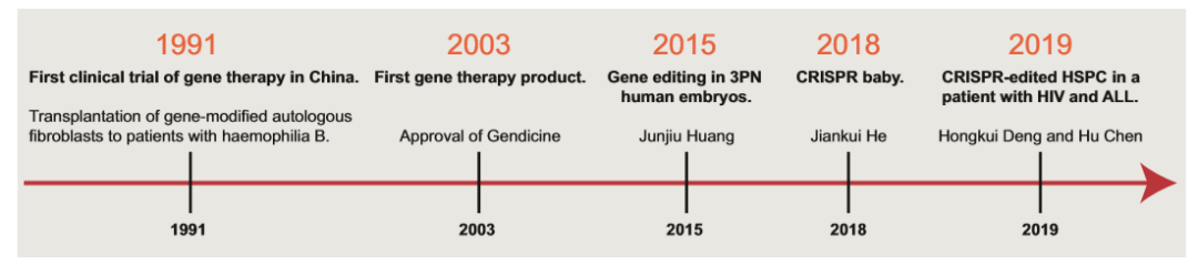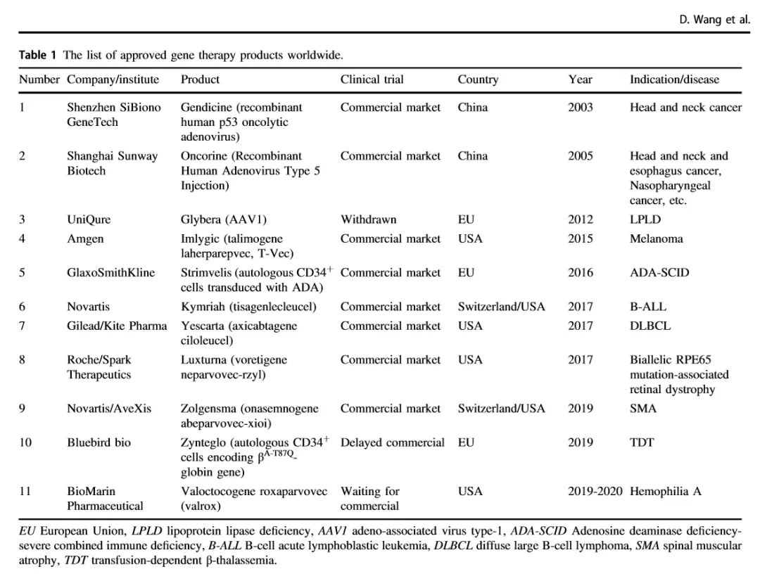 尽管基因疗法最初于国外被开发并展开研究,但从上图中不难发现,世界上首款基因治疗产品其实出现在中国。在基因疗法发展的历史长河上,中国早在1991年就对B型血友病患者展开了世界上第二次的基因治疗临床试验,并于2003年批准获得了世界上第一个基因治疗产品今又生(Gendicine)。随后在约20年的时间里,中国在基因疗法领域方面做出了不断的努力。