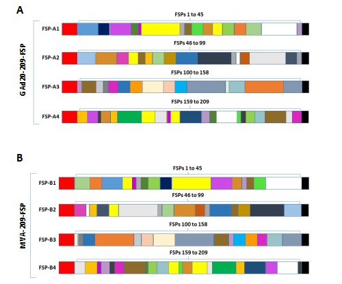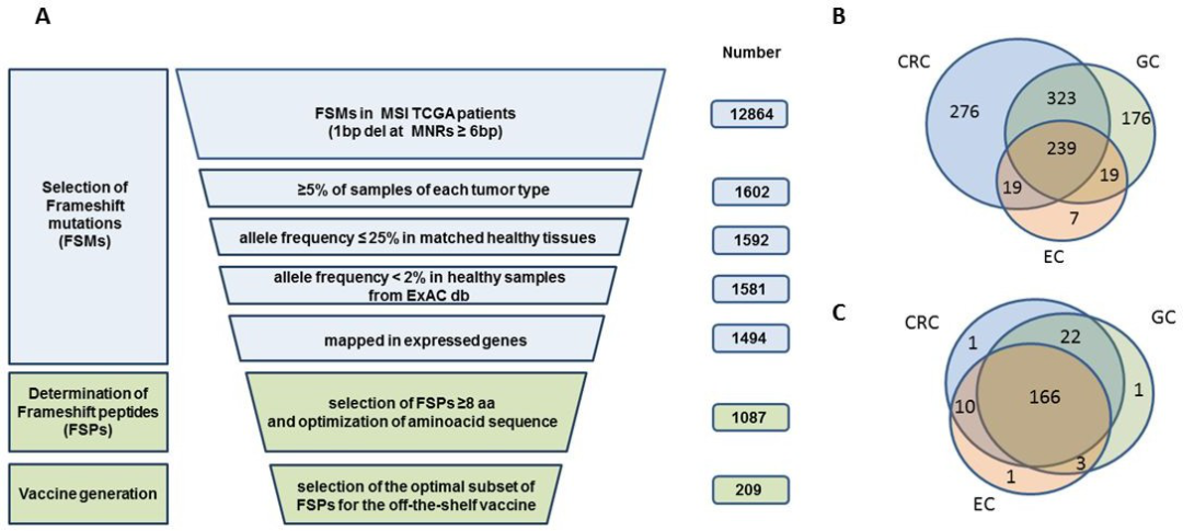 因此在这个研究中,研究人员开发了一种用于治疗MSI肿瘤的新生抗原疫苗。他们认为,与错配修复缺陷(dMMR)和微卫星不稳定性(MSI)相关的肿瘤会积累插入/缺失突变(indels),这些突变可预测,因为它们主要出现在单核苷酸重复序列上。编码区中的这些插入缺失突变导致翻译移位,产生移码肽(FSP)。FSP具有高度免疫原性,可以安全地用于疫苗中,因为它们与人蛋白质组中发现的天然蛋白质序列没有相似之处。因此,它们是理想的肿瘤特异性新生抗原。通过分析来自TCGA数据库中320个MSI肿瘤活检组织和健康组织的遗传序列,以选择共有的FSP。再筛选出209种FSP,