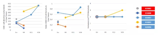 值得关注的是有2名患者肿瘤缩小到可接受手术的范围(图4),且其中一名患者3个病灶中有2个病灶完全退缩,另一个病灶部分缓解。