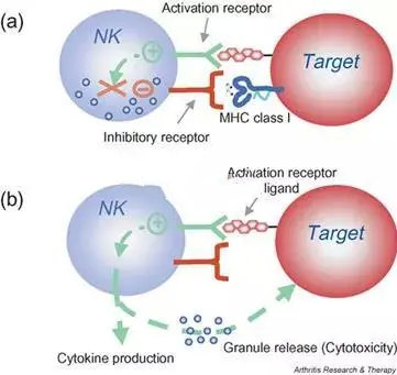 NK细胞的工作机制是,如果细胞表达的MHC-I类分子正常,KIR(抑制性杀伤细吧免疫球蛋白样受体)表达正常,NK细胞就不工作。相反,如果MHC-I 类分子下调,KIR表达降低,NK细胞就容易被激活,一些被激活的NK细胞受体,如NKG2D、NKp30、NKp46和NKp44,可以识别靶细胞上表达的应激诱导配体,从而为NK细胞杀伤靶细胞提供积极的信号,开启杀伤模式。