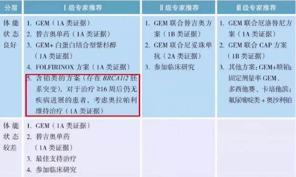含铂类的方案(存在BRCA1/2胚系突变),对于治疗≥1 6周后仍无疾病进展的患者,考虑奥拉帕利维持治疗(IA类证据)