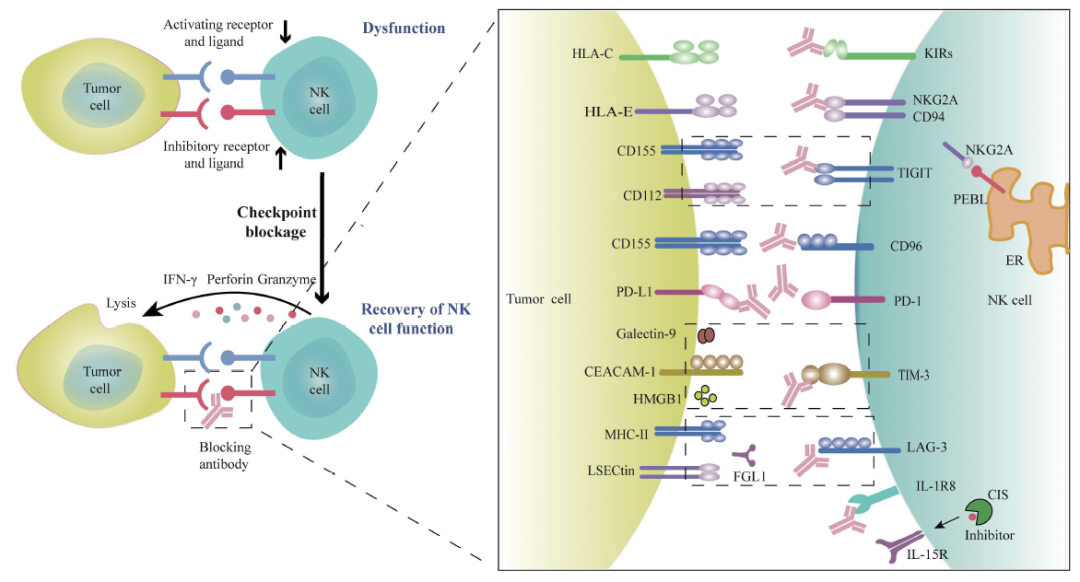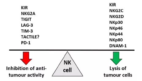 由于长时间的抗原暴露和T细胞受体刺激引起严重的T细胞耗竭,常见于慢性感染和癌症中。T细胞免疫检查点治疗 (immune checkpoint therapy)即以逆转T细胞耗竭并进而增强T细胞的杀癌效应为主。然而,对于NK细胞的肿瘤”免疫耗竭(Immune exhaustion)” 则定义为:在肿瘤发生或癌症进展中,NK细胞效应功能低下的状态。NK细胞的状态往往伴随着NK细胞表面一系列活化性或抑制性受体的改变。通过对NK细胞表面受体功能与NK细胞肿瘤免疫耗竭的研究,临床前研究或临床试验的NK细胞免疫检查点治疗已登上肿瘤免疫治疗舞台。