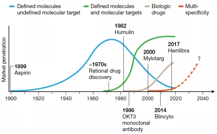第三次革命性浪潮从20世纪80年代开始,以基于重组蛋白的治疗药物为标志。重组DNA方法的发明开启了生物技术产业,1982年,第一个重组人胰岛素(humulin)获得批准;1985年,第一个单克隆抗体muromonab被用作治疗试剂。虽然重组蛋白药物在结构上比小分子复杂,但这两种药物的作用机制相似,都与预定的分子靶点结合并调节其功能。