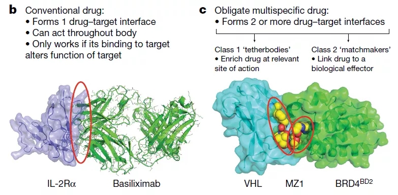 与之不同的是,专性多特异性药物通过两个或两个以上的实体起作用,使药物活性限制在一个特定的位置,或将靶标锚定到内源性效应器旁边,让该效应器对靶标进行调节。专性多特异性药物的特点主要是形成2个或多个药物靶点结合界面,如图2的右图所示,MZ1与靶标BRD4和内源性效应器泛素连接酶亚基VHL同时结合,将BRD4锚到VHL附近,使VHL对BRD4进行泛素化修饰,然后被蛋白酶体降解。