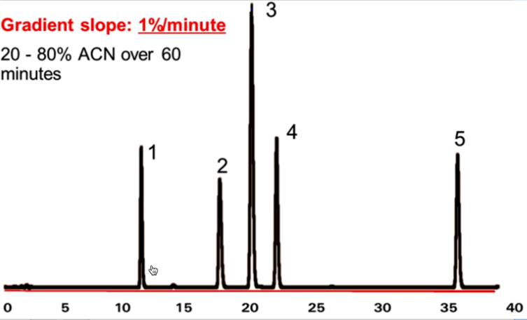 梯度洗脱是的斜率变化,类似于等度洗脱时溶剂的强度。增大梯度洗脱的斜率或等度洗脱的溶剂强度,都可以减少分析时间,但也会降低分辨率。反之亦然。同时这两者也会影响选择性。梯度洗脱的目的就是在分析时间最小化的时候获得最优化的分辨率。