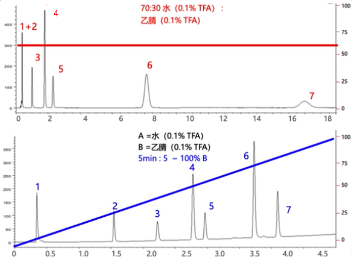 我们可以看出,梯度洗脱的分辨率更好,特别是峰1和峰2的分离,同时梯度洗脱也节约了更多分析时间。
