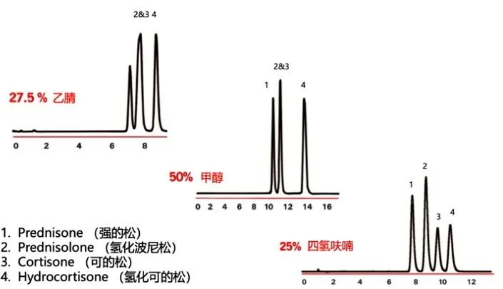 用乙腈,甲醇,THF分别对相同的四种类固醇类物质进行分析,色谱图显示了三种溶剂间的选择性差异。