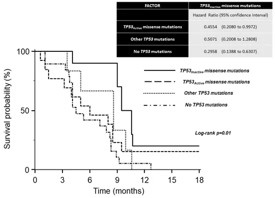 不同基因状态中位OS时间为:TP53 非活性错义突变携带者9.5个月;其他TP53突变携带者为8.6个月;TP53 主动错义突变携带者6.0个月;无TP53突变的患者4.5个月。