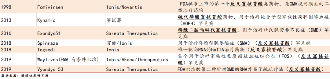 反义寡核苷酸(ASO)是一种合成的单链寡核苷酸,具有不同的化学成分,包含与靶RNA转录物互补的序列。ASos具有广泛的应用,包括阻断mRNA的翻译、竞争性抑制miRNA、沉默靶miRNA、外显子跳跃、外显子包合和核酸酶H介导的靶降解。在这些应用中,靶向核酸酶H介导的降解是最有效的。目前,ASO已有多款药物获批,领先公司Ionis已证明ASO药物成药性上的可行性。