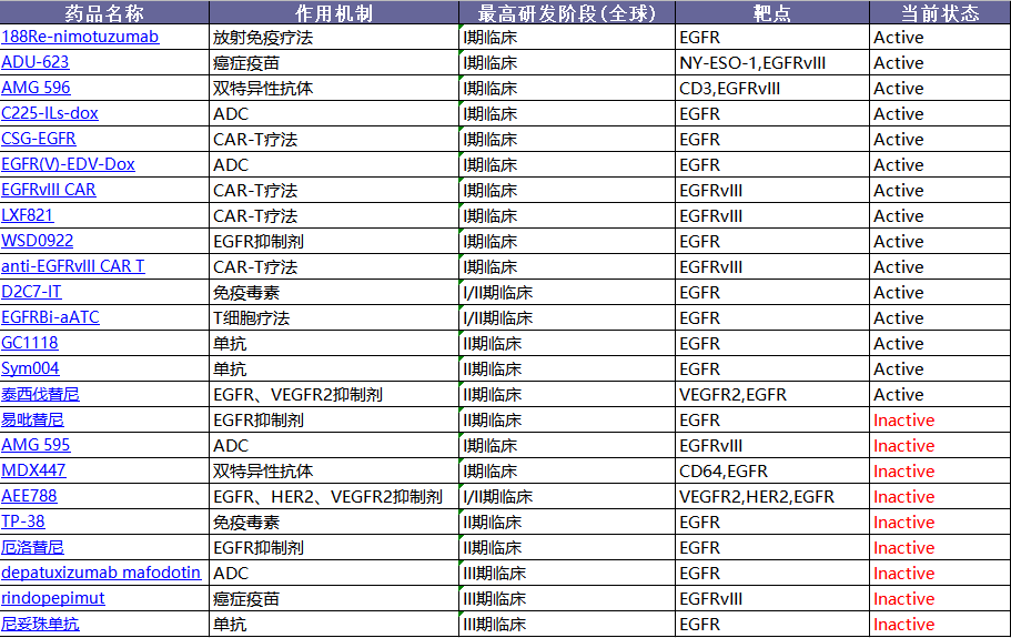 据统计,针对GBM适应症,推进至I/II/III期临床的EGFR项目共有24个,其中9个已经失败(包括1个单抗、3个小分子靶向药、1个癌症疫苗、2个ADC药物、1个免疫毒素、1个双抗),目前仍在开发中的EGFR项目的主要处于I期(10个)和II期(6个),此前进入III期阶段的项目全部以失败告终。各种数据分析,EGFR靶向治疗的研发失败率较高可能与药物的透血脑屏障、疾病信号通路的复杂性等有关。