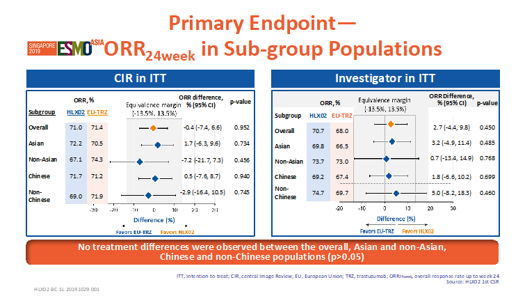 根据截至到2018年11月27日的数据,共649例患者被随机分配到两个治疗组(HLX02组=324;原研组=325)。HLX02组24周的最佳总缓解率为71.0%,原研组为71.4%,两组间无统计学差异。24周的ORR组间差异为-0.4%,其95%置信区间 (-7.4%, 6.6%) 在预设等效区间内(-13.5%,+13.5%),HLX02和原研曲妥珠单抗(欧洲市售)疗效等效性成立。除此之外,亚组(亚洲 vs. 非亚洲,中国vs.非中国)分析显示,HLX02组与原研组24周的ORR在不同人群中无统计学差异(p>0.05),进一步验证了HLX02与原研曲妥珠单抗(欧洲市售)的疗效相似性。