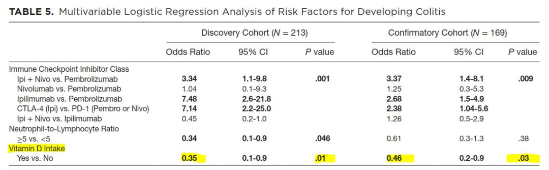 同步接受维生素D的患者,发生免疫性肠炎的概率是16.2%;而不接受维生素D的患者,发生肠炎的概率是83.8%。维生素D的使用,使免疫性肠炎的发生率下降了65%。
