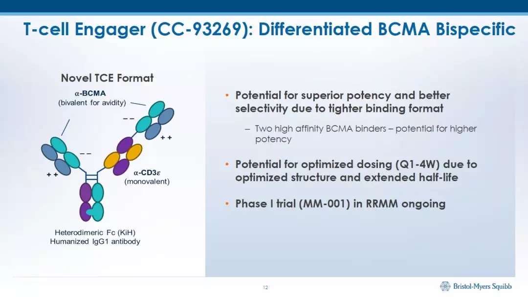 2016年,新基以6亿美元收购了瑞士EngMab公司中获得了一款BCMA/CD3--EM801(现名为CC-93269),CC-93269是一种基于IgG1的人T细胞接合器(engager),具有两个BCMA结合域,以2+1形式结合BCMA和CD3。