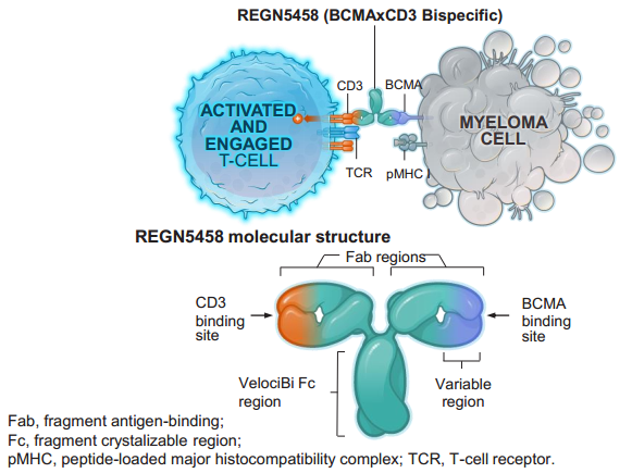 REGN5458是再生元公司基于其VelocImmune和VelociBi技术平台开发的靶向BCMA和CD3的双抗,该公司公布的最新数据显示,前7名接受REGN5458治疗的受试者中有4名获得缓解,包括1例CR,剂量仍在逐步升高,并且尚未达到剂量限制性毒性(DLT)。值得注意的是,该研究的受试者经历中位数为7种的前线治疗失败。