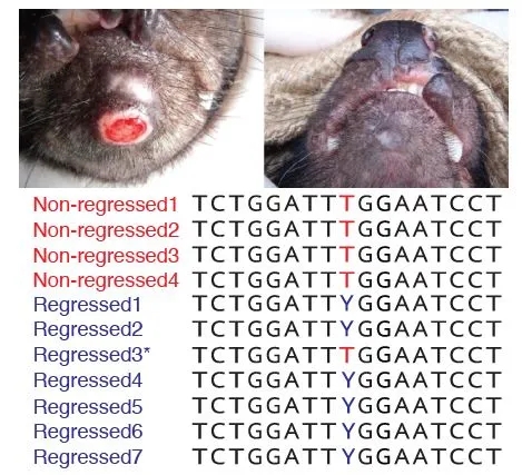 ▲同一只袋獾,时隔一年,面部的肿瘤明显变小;这些肿瘤自行缩小的袋獾,在RASL11A基因上几乎都有一个点突变(图片来源:参考资料[1])