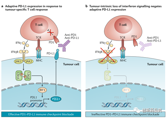 释放IFN-γ到肿瘤微环境中来杀伤肿瘤细胞是T细胞杀伤肿瘤细胞的重要手段,然而肿瘤细胞内部也存在着对抗这种IFN-γ杀伤的信号机制:IFN-γ与肿瘤细胞表面的受体(IFNγR)结合可以激活肿瘤细胞内部的JAK-STAT信号通路,并后续激活IRF1从而上调PD-L1的表达水平,而PD-L1水平的上升会对T细胞的活性产生抑制并因此而对抗T细胞的进攻(下图a)。在这种情况下,采用PD-1或PD-L1单抗治疗能够将T细胞从PD-L1的抑制状态中解救出来并恢复其功能。然而,许多肿瘤细胞的JAK1、JAK2等基因往往会发生突变,这会导致上述信号通路的失活(下图b),因此对这样存在着JAK1、JAK2等基因突变的肿瘤细胞进行PD-1、PD-L1单抗治疗,其效果将会大打折扣(毕竟这些肿瘤细胞并不依靠PD-L1来抑制T细胞的活性)。