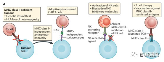 我们已经知道,肿瘤细胞可以通过下调MHC的表达来减少细胞表面抗原的呈递来逃脱免疫监视。过继细胞疗法如CAR-T和CAR-NK疗法可以不依赖于MHC对肿瘤细胞进行杀伤,从而可以有效对抗免疫耐受的肿瘤细胞(如下图所示)。这方面的内容因篇幅所限这里不再赘述,有时间的话我会写一篇文章对CAR-T和CAR-NK疗法进行详细讨论: