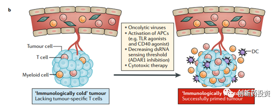 但仅管如此,目前仍然有一些肿瘤对于免疫检查点阻断的应答率极低,在这些肿瘤中即使是联合用药也难以收获理想的结果(我们称这样的肿瘤为冷肿瘤cold tumor)。对于这样的病人,我们需要先采用一些手段 “启动”(prime)免疫反应,在免疫反应成功“启动”之后再用免疫检查点抑制剂来增强(enhance)T细胞的功能从而将cold tumor转化为hot tumor是较为可行的技术路线。比如,可以通过溶瘤病毒裂解肿瘤细胞释放抗原、通过TLR、CD40的激动剂来激活抗原呈递细胞、通过激活肿瘤细胞对dsRNA的敏感程度来增加肿瘤细胞的抗原性: