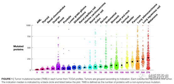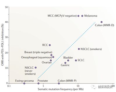 免疫系统主要依靠肿瘤细胞表面的抗原来特异性识别肿瘤细胞。那么,什么样的抗原能够将肿瘤细胞与正常细胞区分开呢?目前的研究认为,一类被称作肿瘤新生抗原(tumor neoantigens)的抗原发挥了这种功能。肿瘤新生抗原主要由基因突变产生,突变的基因翻译成蛋白并经过MHC的抗原呈递到达细胞膜形成肿瘤新生抗原。不同的肿瘤细胞内部的基因突变含量不同,肿瘤突变负荷(tumor mutational burden,TMB)便是用来衡量基因突变含量多少的一个指标。TMB较高的肿瘤,如黑色素瘤(如下图所示),对于免疫治疗的应答相对较高。除此之外,微卫星不稳定性(microsatellite instability,MSI)也可以反映肿瘤抗原性的高低。MSI反映了肿瘤细胞DNA错配修复能力,错配修复能力较弱的肿瘤细胞不仅MSI水平较高,也会在基因组上引入较多的突变从而增加其抗原性。