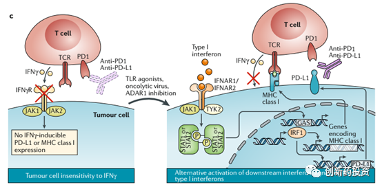 除了上述手段以外,采用一些先天性免疫激活剂(agonists of innate immune sensors)来增加肿瘤细胞的抗原性也是可行方案之一。例如可以利用type I interferon的激动剂来激活肿瘤细胞的抗原提呈过程,这种手段尤其适合IFN-γ信号通路失活的肿瘤细胞(原因上面已经提到):