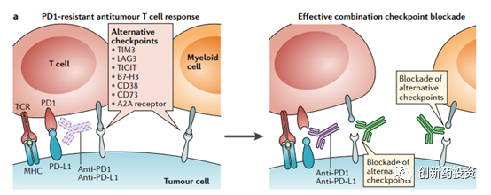 如何增加肿瘤细胞对免疫治疗的应答?一个最直观的解决方案就是采用多种免疫检查点抑制剂联合用药。已有大量数据显示,CTLA-4与PD-1/L1抑制剂联合用药可以获得较为理想的免疫应答。除了CTLA-4与PD-1/L1之外,LAG3,VISTA, TIM3等靶点的免疫治疗药物也在紧锣密鼓的研发之中。不同的免疫检查点下游信号通路不同,联合用药将能有效解决耐药问题。
