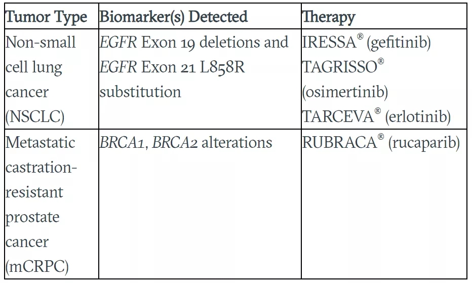 ·作为伴随诊断,确定可能从FDA批准的特定靶向疗法中获益的患者,包括为PARP抑制剂Rubraca(Rucaparib)筛选携带BRCA1/2基因突变的转移性去势抵抗性前列腺癌患者,以及使用EGFR酪氨酸激酶抑制剂(TKI)(吉非替尼、奥西替尼和厄洛替尼)进行一线治疗的三种非小细胞肺癌患者;