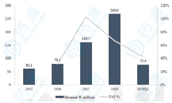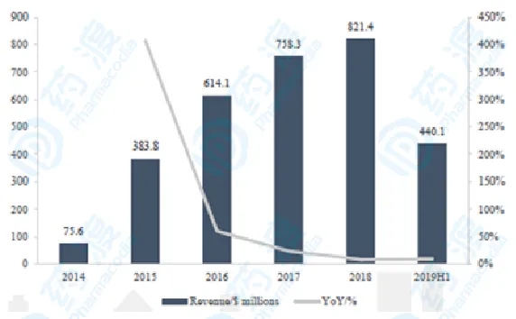 图7 2014-2019H1 CYRAMAZA全球收入及增速,药渡咨询郭雷团队整理