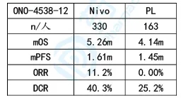 纳武单抗治疗二线及以上化疗失败后的晚期胃/胃食管交界腺癌III期临床,与安慰剂相比,患者死亡风险显著降低37%,两组1年总生存期分为26.2%和10.9%,但mPFS改善程度较小。