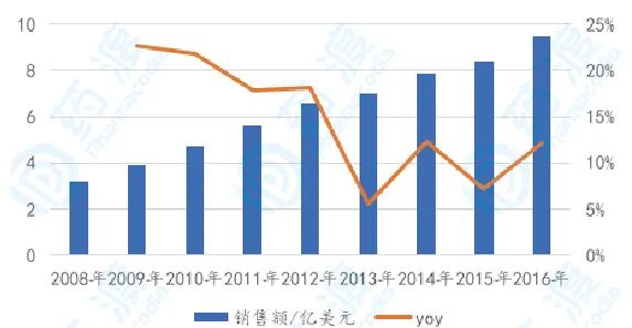 图1 2008-2016年中国重点城市公立医院胃癌药物市场与增速,药渡咨询郭雷团队整理