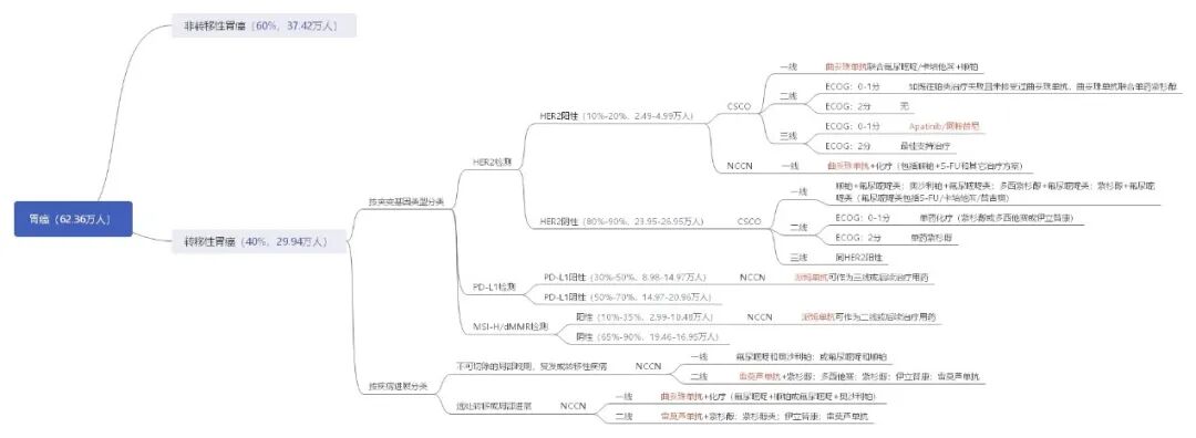 图4CSCO/NCCN胃癌诊疗指南,备注:非转移性胃癌以手术/内镜治疗为主,不在此详述。CSCO指南仅列举各线首选治疗手段,药渡咨询郭雷团队整理