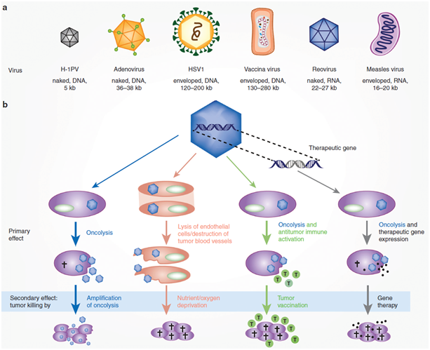 Fig 1. 多样化的溶瘤病毒及其作用机理