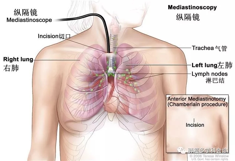 纵隔镜检查: 这种外科检查的切口在胸骨的上端,纵隔镜从这里插入胸腔,观察肺与病变组织之间的器官、组织和淋巴结情况。纵隔镜的前端带有光源和透镜便于观察,并带有工具用于切取组织和淋巴结的标本。
