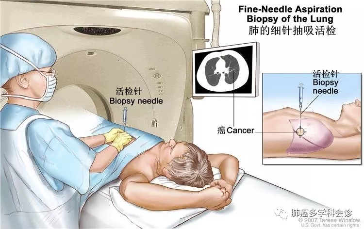 肺细针穿刺活检:用细针穿刺(FNA)来抽取机体的组织或体液。先用CT、超声或其他影像检查对肿块或积液进行定位,再用细针抽取组织或体液,然后把标本送检,由病理医生在显微镜下观察是否有癌细胞。细针穿刺之后可拍胸部X线片来观察是否在穿刺过程中有气体漏入胸膜腔(气胸)。