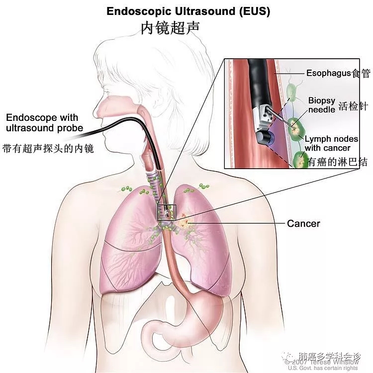 内镜超声(EUS),内镜超声用于引导对肺、淋巴结或其他部位进行细针穿刺抽取活检。EUS是把一种带有超声的内窥镜插入体内,通过超声探测体内组织器官的图像,如下图所示,食管EUS在超声的引导完成对其周围淋巴结的穿刺活检,活检组织会送到病理科,病理专家在显微镜下观察送检的组织中有无癌细胞存在。