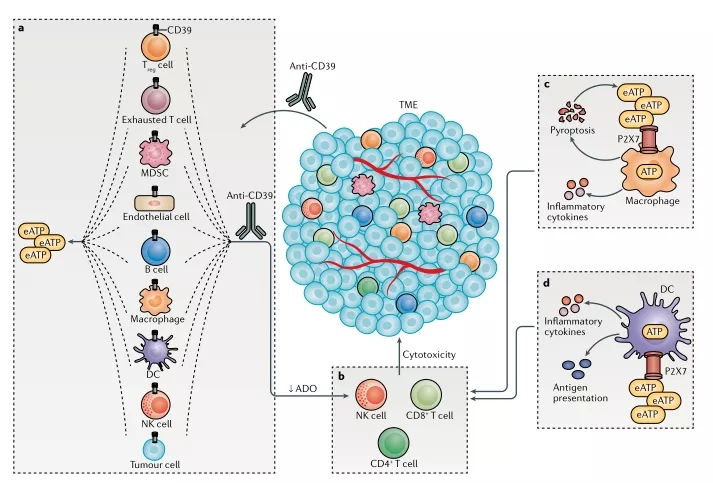图5.CD39 通过多种机制增强抗肿瘤效力